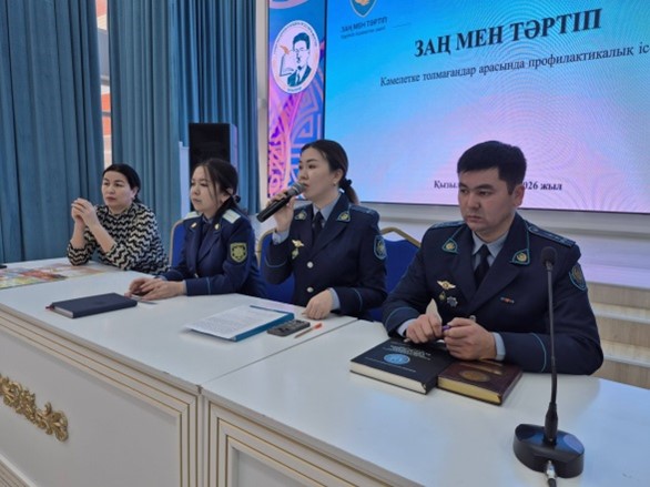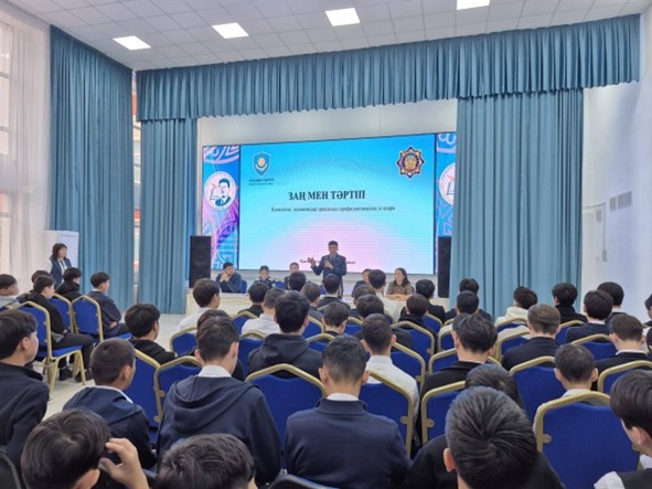 Серікқызы Арайлым, ҚПБ ҚҚб ЮПБ аға УПИ полиция майоры Саменова Маншук Жаксылыковна қатысып, оқушыларға жасөспірімдер арасындағы ұрлық, топтық төбелес, қылмыс пен құқық бұзушылық фактілерінің алдын алу, буллинг, лудомания, кибербуллинг, есірткі, әлеуметтік желі зияндылығының алдын алуға бағытталған түсіндірме жұмыстарын жүргізді. ҚР Әкімшілік құқық бұзушылық туралы кодексінің 442, 127, 132, 200, 434, 435, 437 баптарын толықтай атап өтті. ҚР Қылмыстық кодексінің 99, 106, 190, 191, 194, 188, 187, 293, 124 баптары бойынша кәмелетке толмаған адамдарды тәрбиелеу жұмыстарына тоқталып, баланың заңды өкілі ата-ана болғандықтан, оның әрбір заңға қайшы әрекетіне ата-ана жауапты екендігін ескертті.