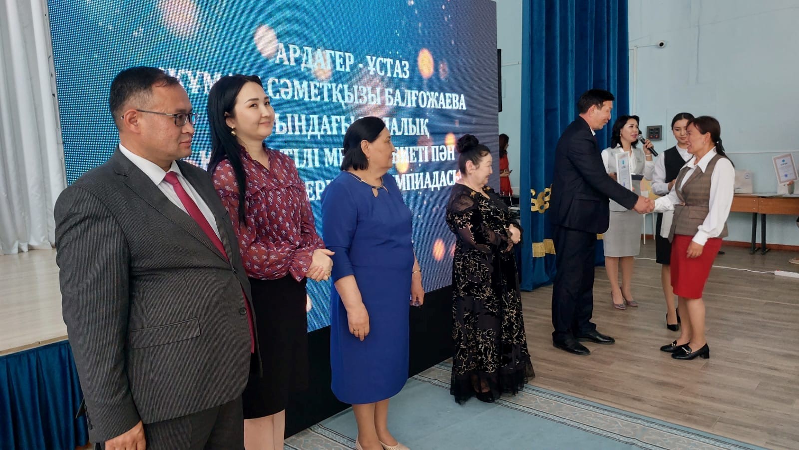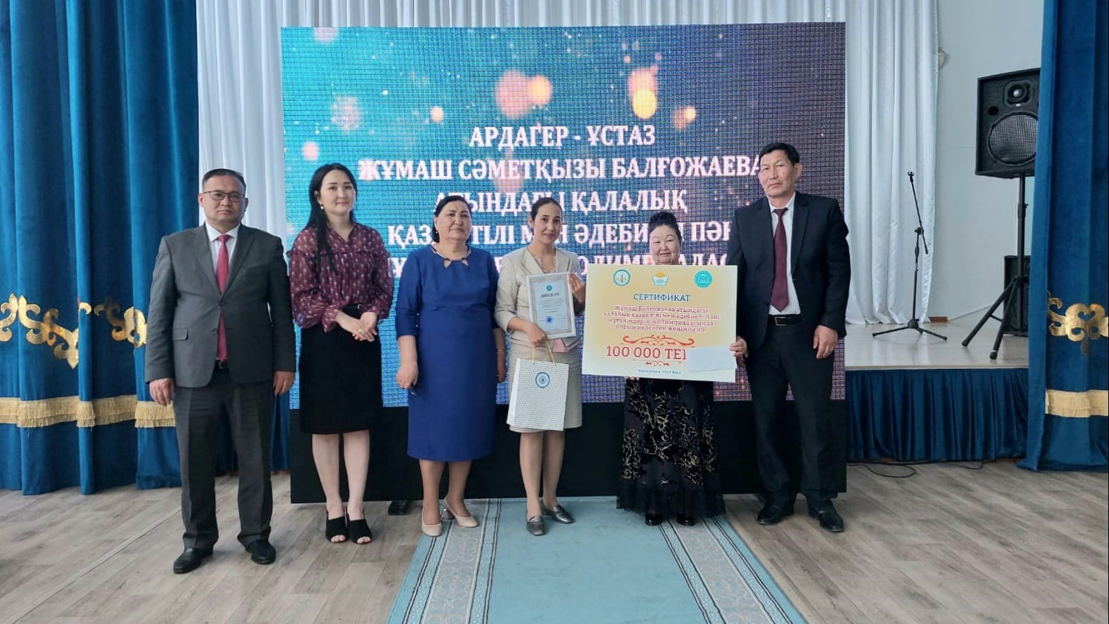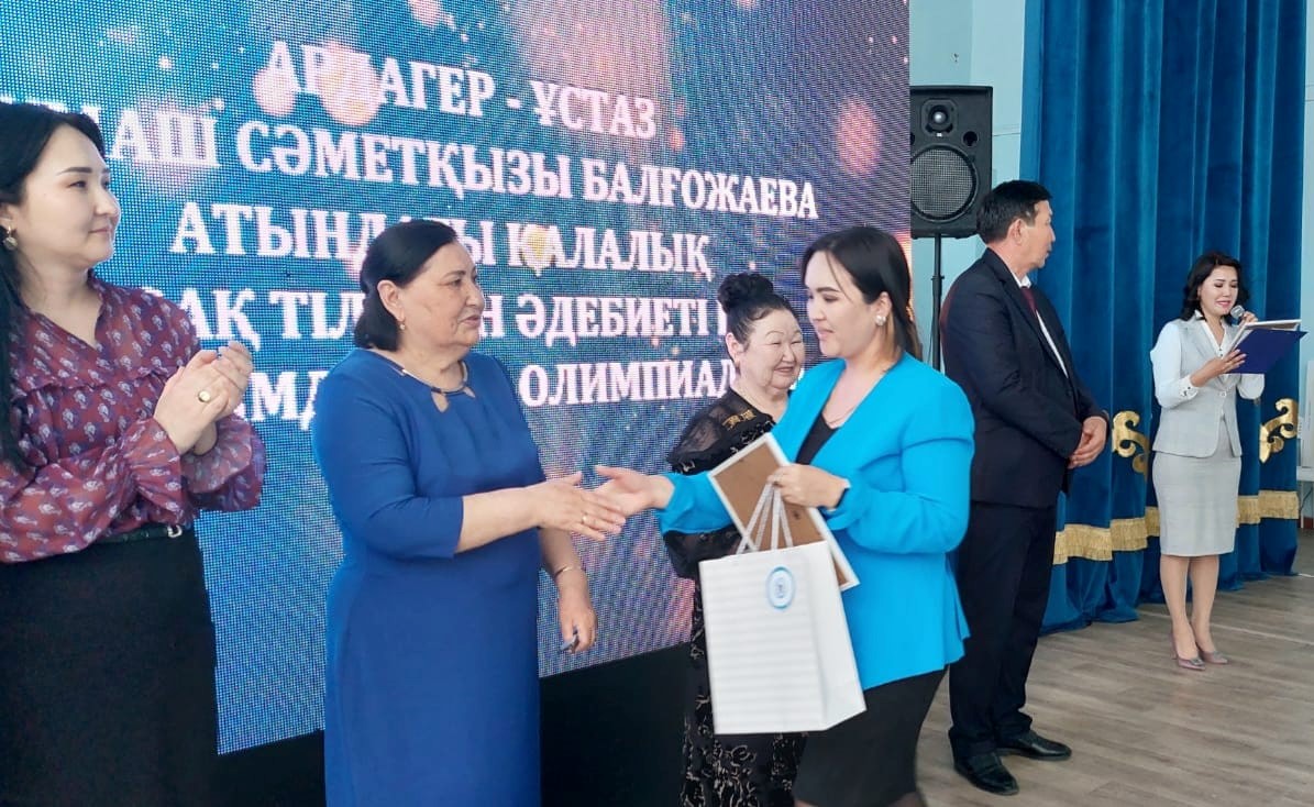 "Ұлттық құндылықты ұлықтаушы ұстаз" номинациясымен ^15 мектеп гимназиясының қазақ тілі мен әдебиеті пән мұғалімі Балтабаева Айзат